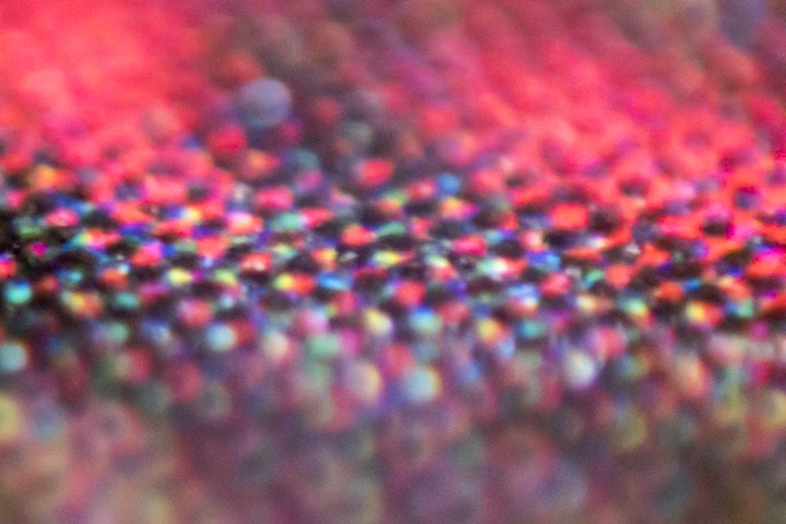 これらを組み合わせた結果が上の写真です。何を撮ったかというと、iPadです。あまりにも接写すぎてiPadの素子が撮れたのです。きれいにRGB、赤緑青の光の三原色が並んでいますね。
